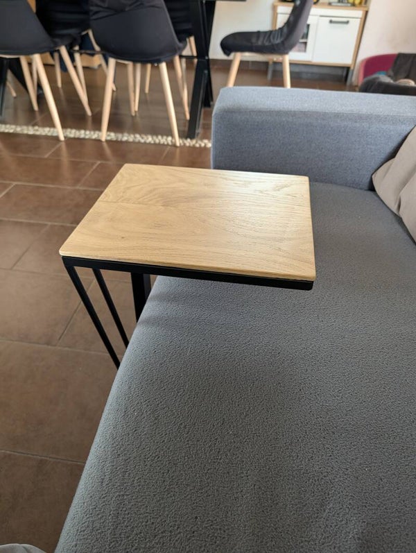 Voici un bout de canapé original en acier et le plateau en chêne massif.